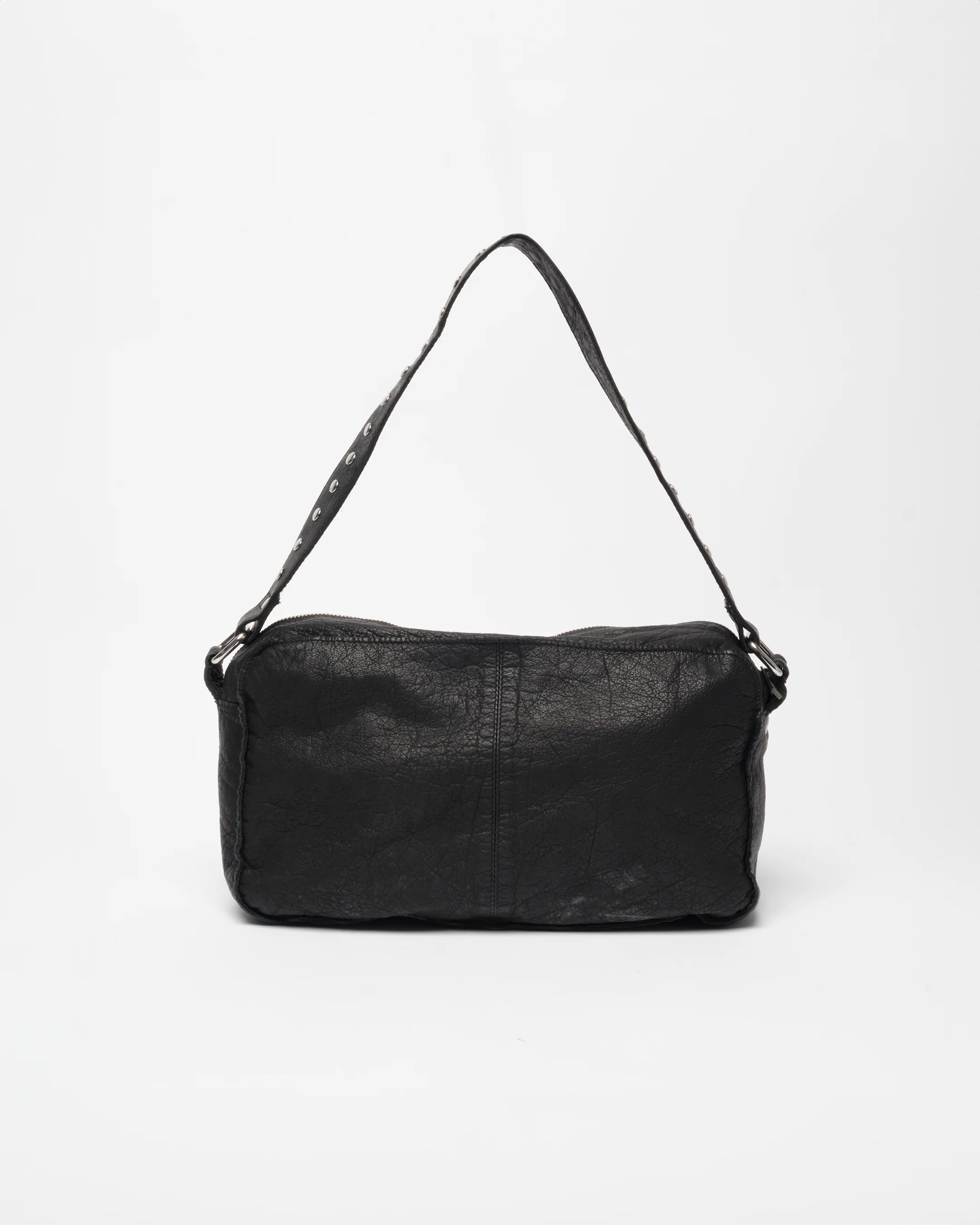 Alimakka in black washed leather, has been sewed and washed. The many zippers give the bag a cool look as well as practical. The long strap is adjustable and removable, which makes it perfect as a crossbody bag. The short strap is made with cool rivets.