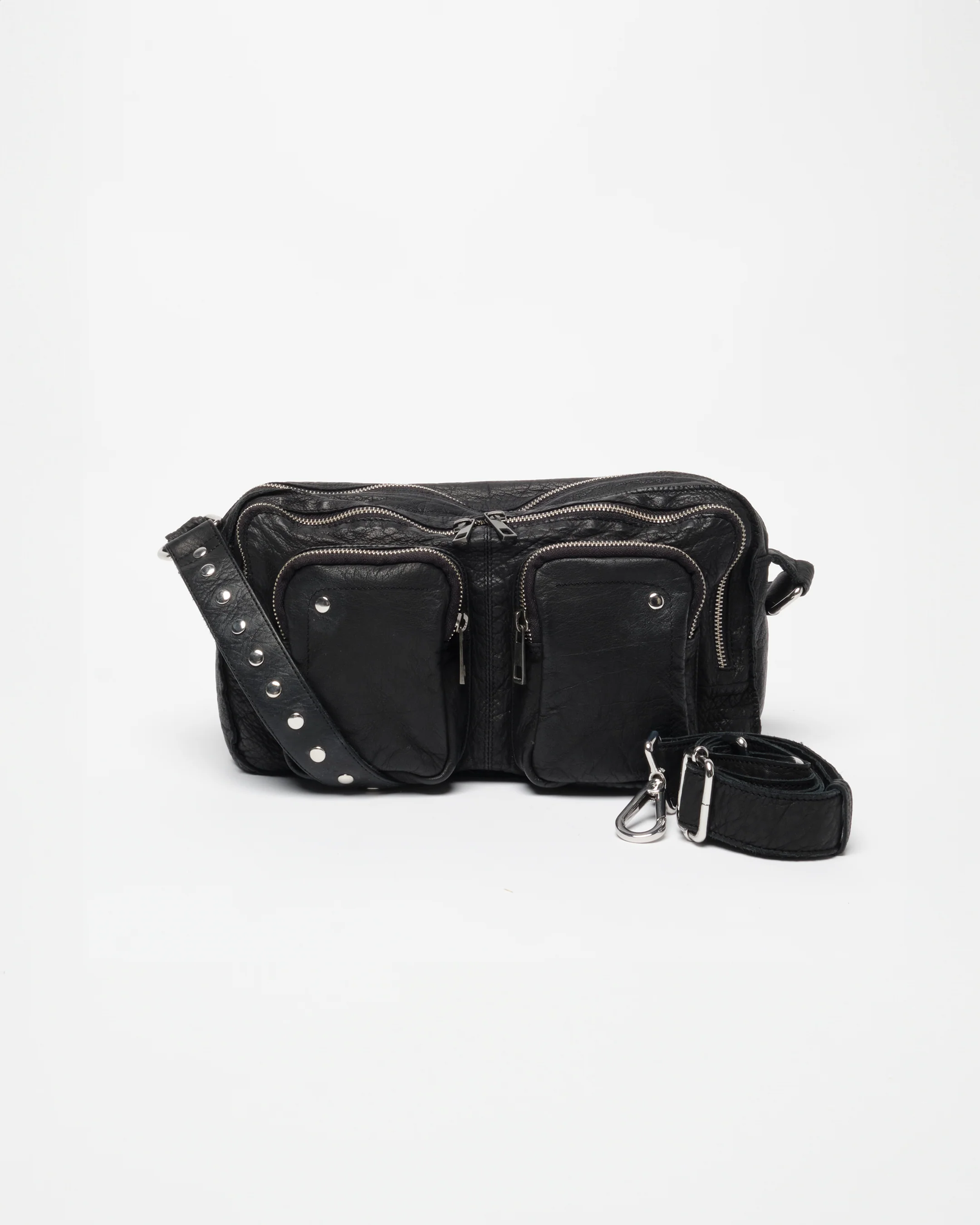 Alimakka in black washed leather, has been sewed and washed. The many zippers give the bag a cool look as well as practical. The long strap is adjustable and removable, which makes it perfect as a crossbody bag. The short strap is made with cool rivets.