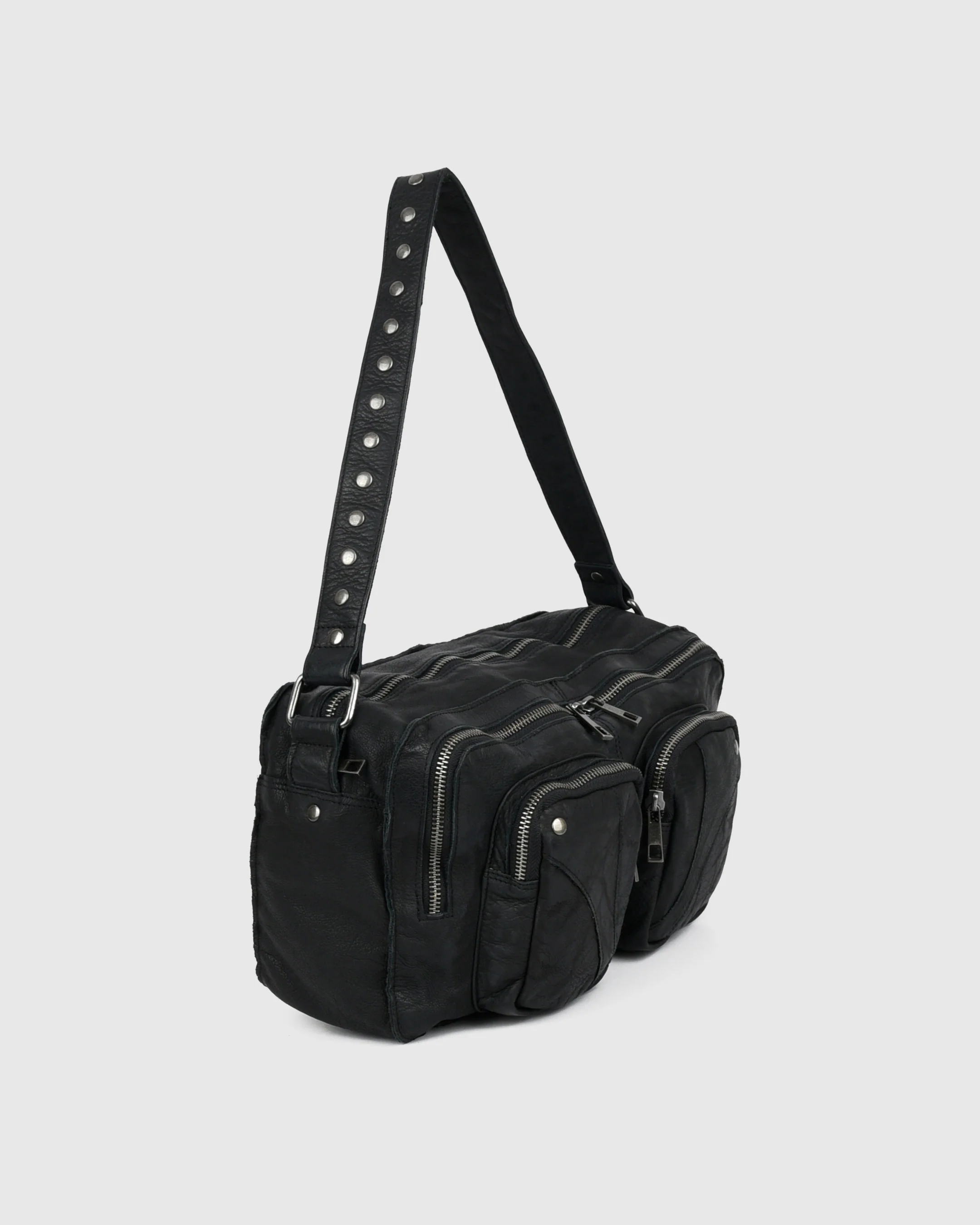 Alimakka in black washed leather, has been sewed and washed. The many zippers give the bag a cool look as well as practical. The long strap is adjustable and removable, which makes it perfect as a crossbody bag. The short strap is made with cool rivets.