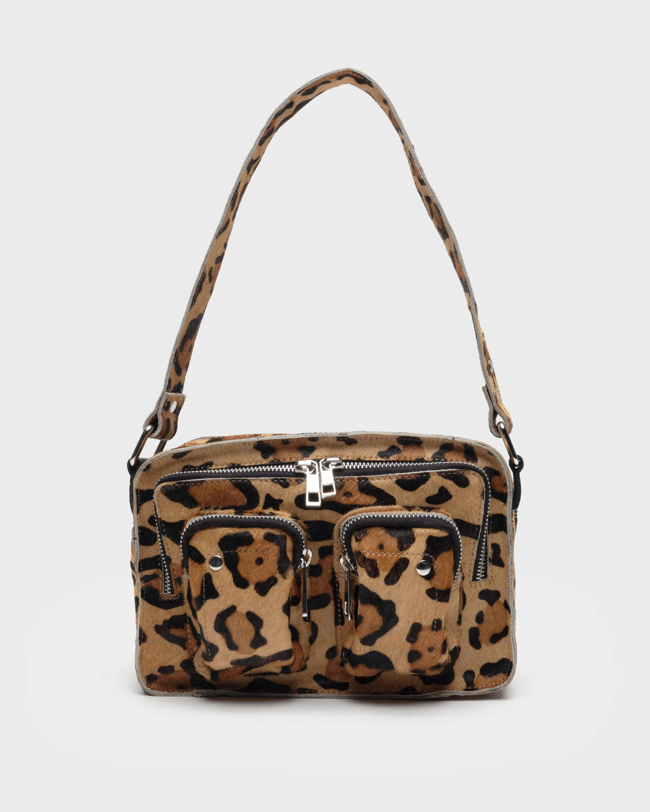 Ellie with leopard print. The bag features a spacious main compartment, a smaller compartment, and two small front pockets. It can be worn over the shoulder or as a crossbody bag and comes with an adjustable strap. Being made from natural material, the hair may wear off over time, which is normal what and tear.