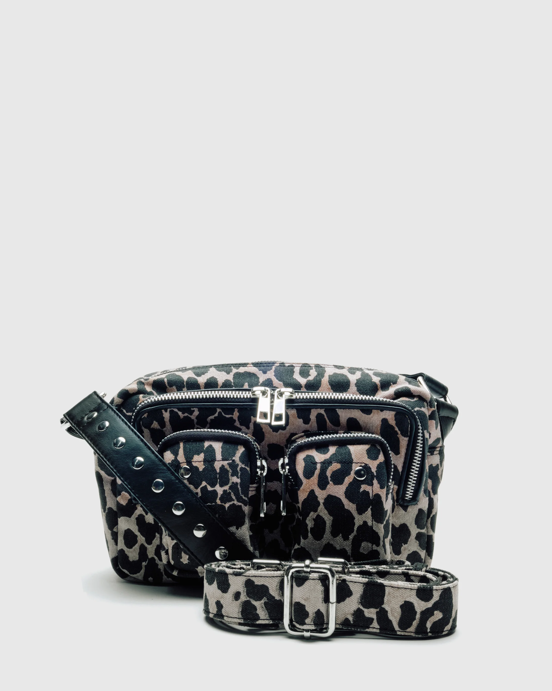 The Ellie bag in Dots comes with two leather straps for the bag. The long strap is adjustable and removable. The bag has two large compartments and two smaller pockets on the front.