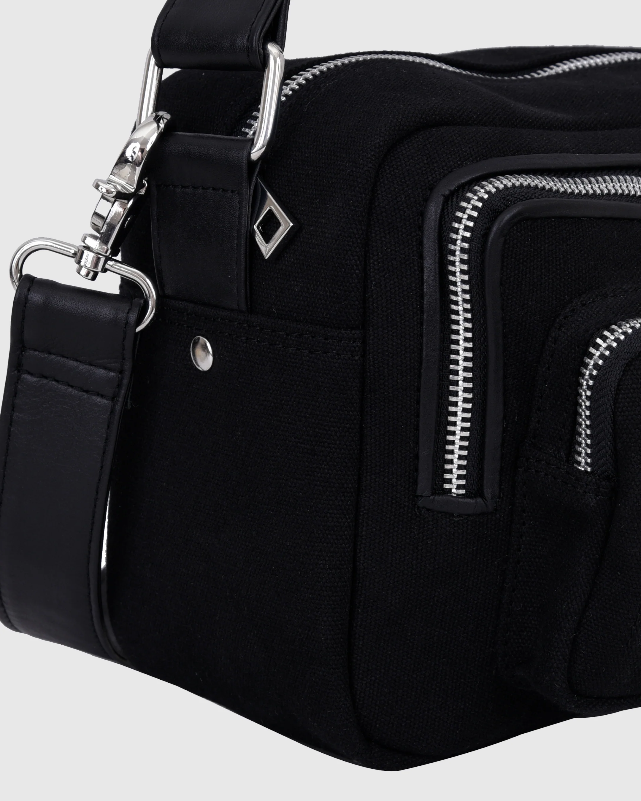 The bag is made of recycled canvas. The bag has a main compartment, a compartment on the front of the bag and two small pockets which all close with a zip. The bag has a shoulder strap and adjustable strap which can be removed.