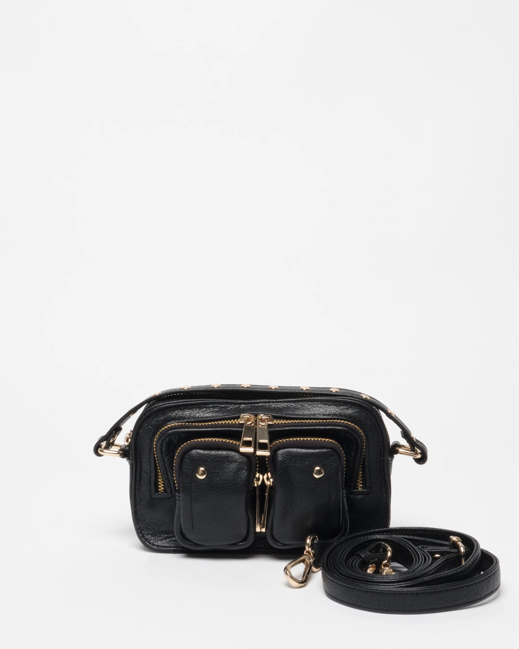 Helena in our air leather with antique gold details. The bag has a large main compartment that closes with a zipper. On the front of the bag, there are three smaller compartments that also close with zippers. The bag comes with both a gold chain and an adjustable leather strap.