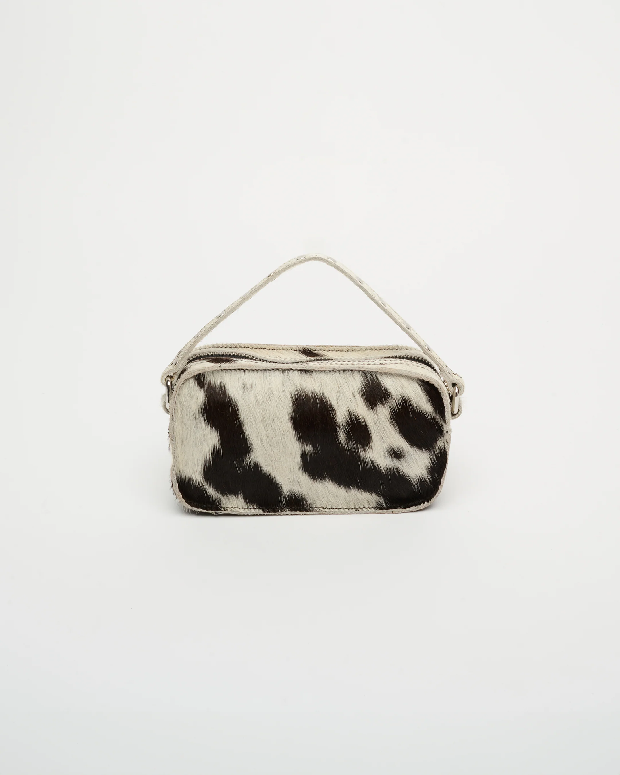 Classic Helena bag in cow print. The bag has one main compartment closing with a zipper. The bag has an adjustable bag and a chain strap.