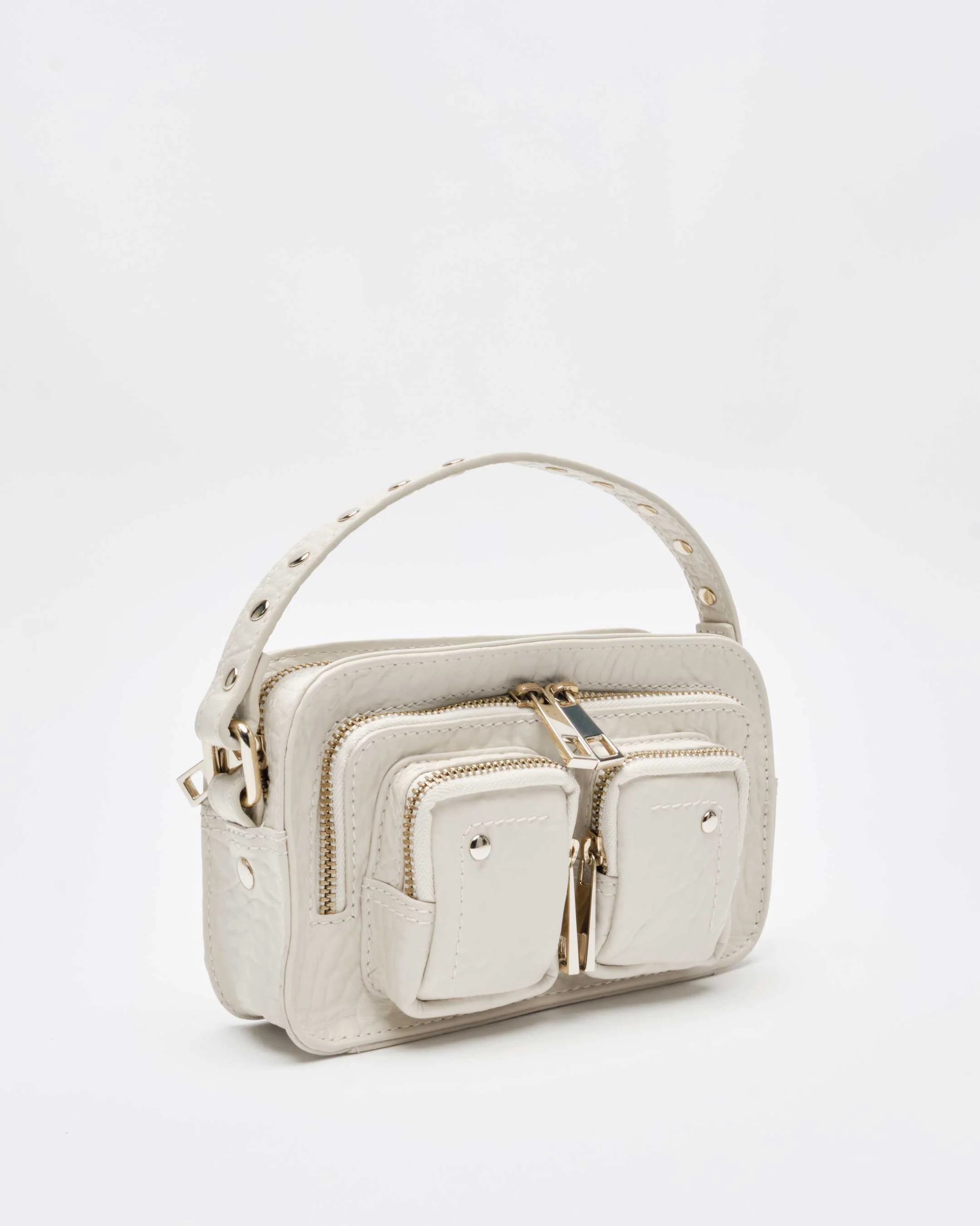 The Helena bag has a main compartment with an inner pocket. In addition, the bag has three small compartments on the front, which close with a zip. The bag comes with an adjustable leather strap and a chain. The bag has gold details.