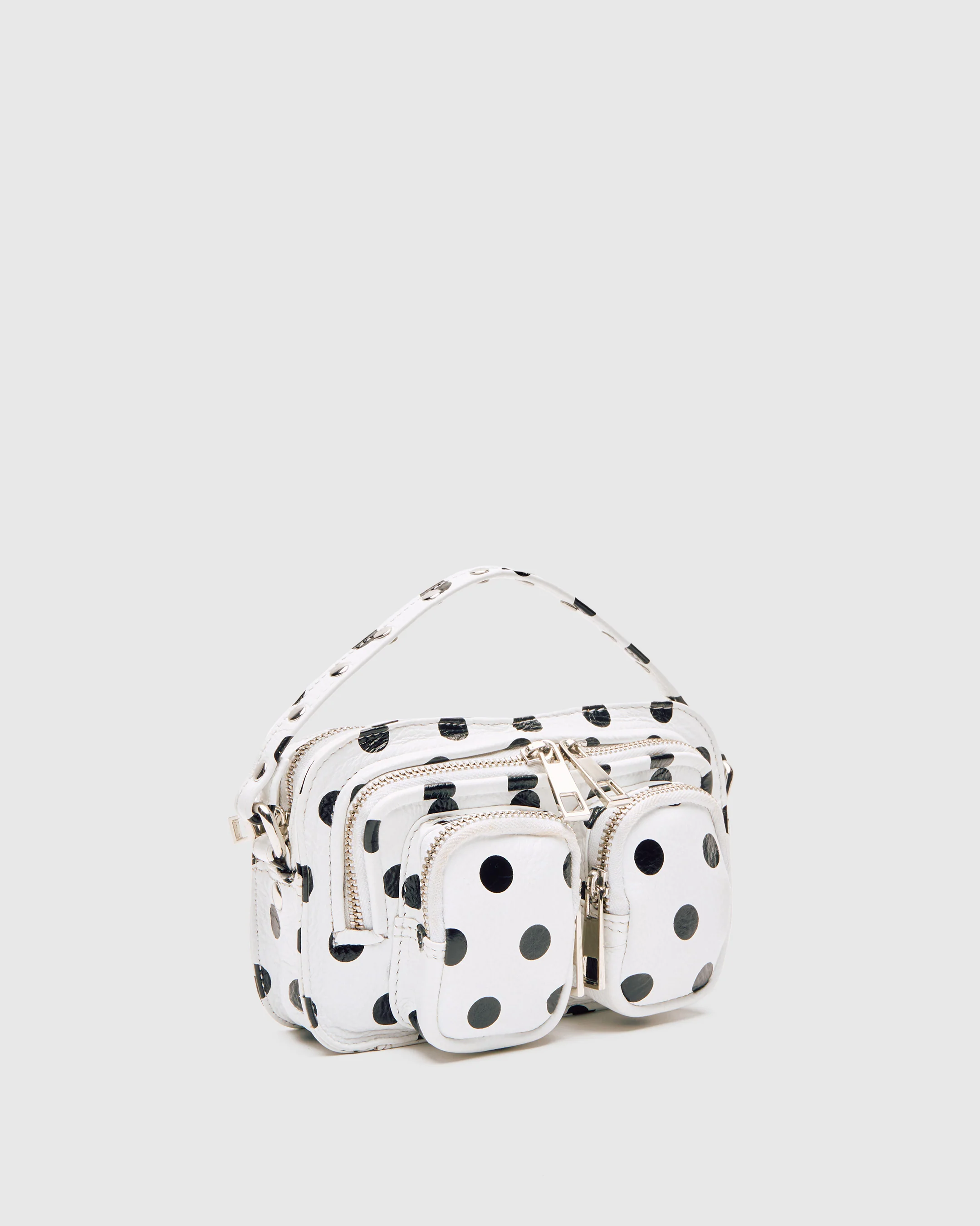 Helena Polka White/Black is a trendy bag in white with black polka dots and silver details. The bag features one large main compartment, a slightly smaller compartment, and two separate front pockets — all with zip closures, making it easy to organize and securely store your belongings. It comes with an adjustable leather strap, allowing it to be worn crossbody, over the shoulder, or carried by hand.