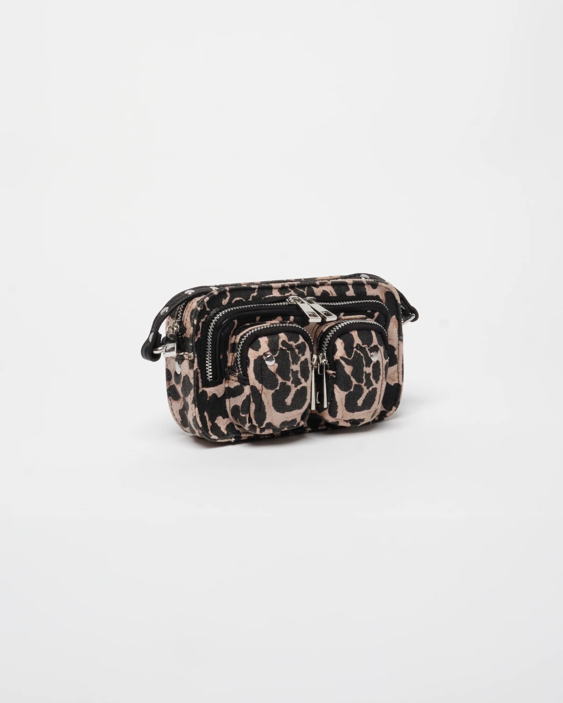The Helena bag with Leo print is made of recycled canvas. The main compartment of the bag closes with a zipper. The three small compartments on the front of the bag are also closed with zips. A chain and an adjustable strap for the bag are included.