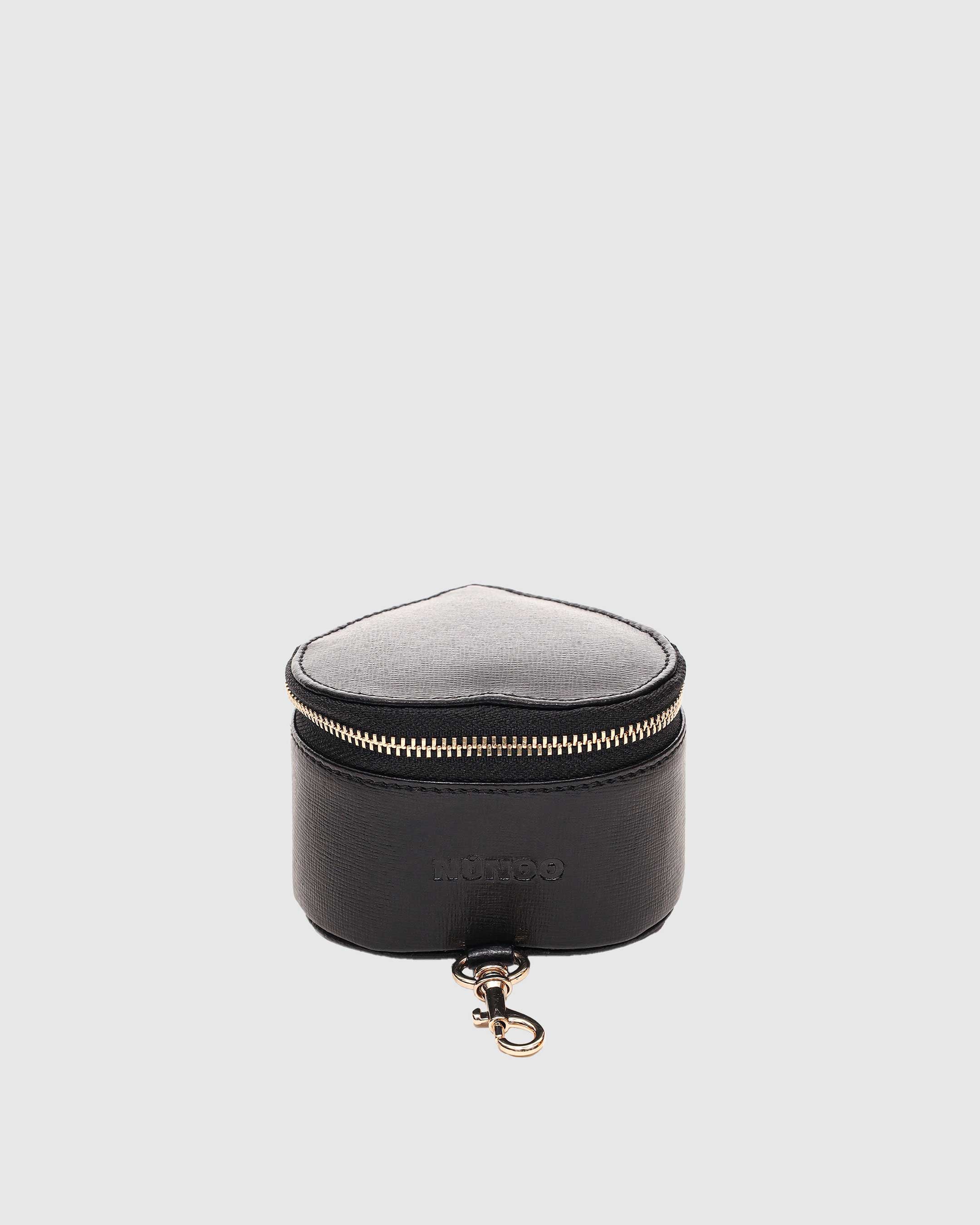 The Jewelry Box in black with gold details is a stylish and practical way to store your favorite pieces. Designed in a charming heart shape, it adds a touch of elegance to your accessories. The zip closure keeps your jewelry secure, while its compact size makes it perfect for traveling or keeping in your bag on the go.