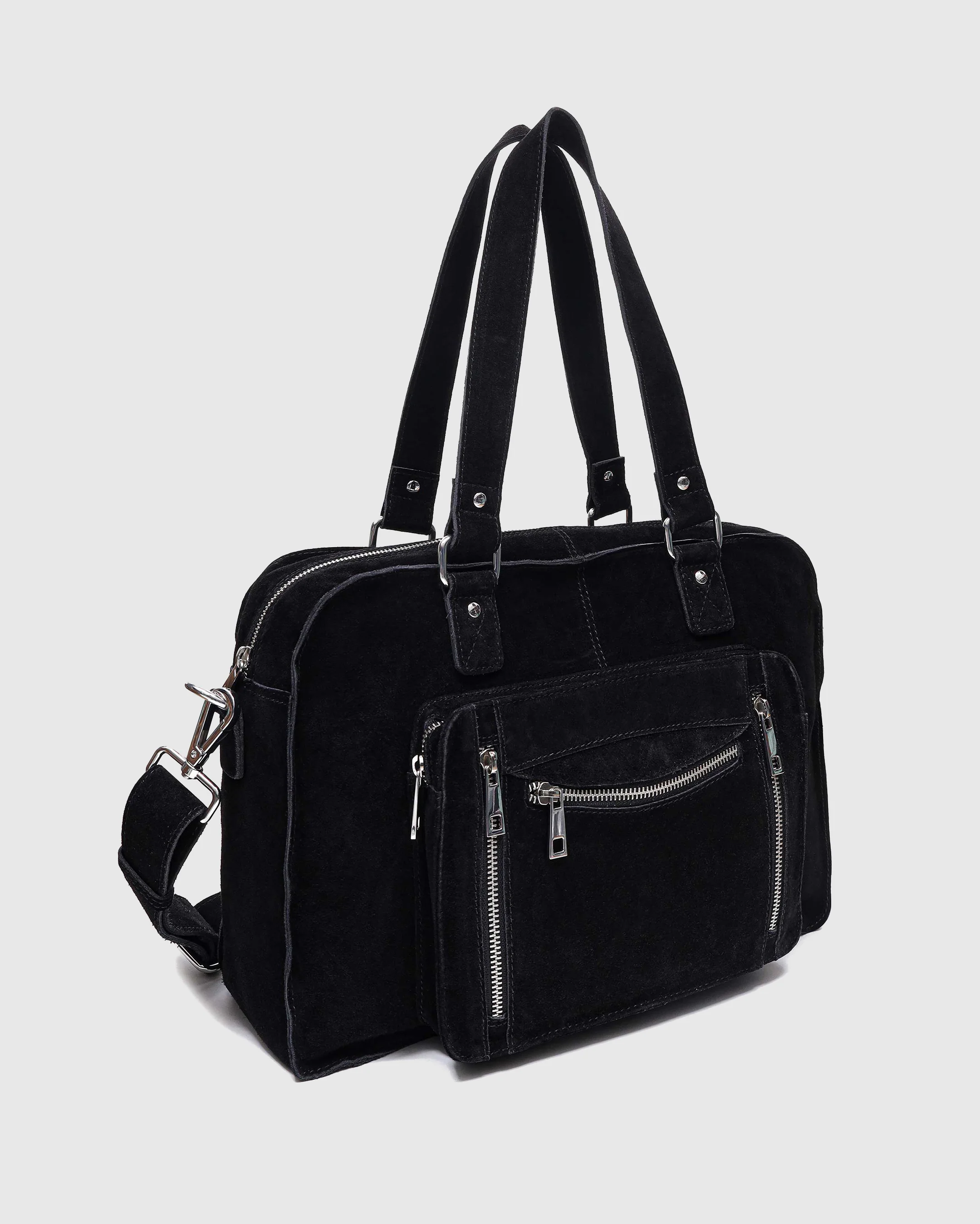 The bag is made of suede, and has a large compartment with two shoulder straps. On the front of the bag you will find a small pocket. The bag closes with a zipper. An adjustable strap is included with the bag.