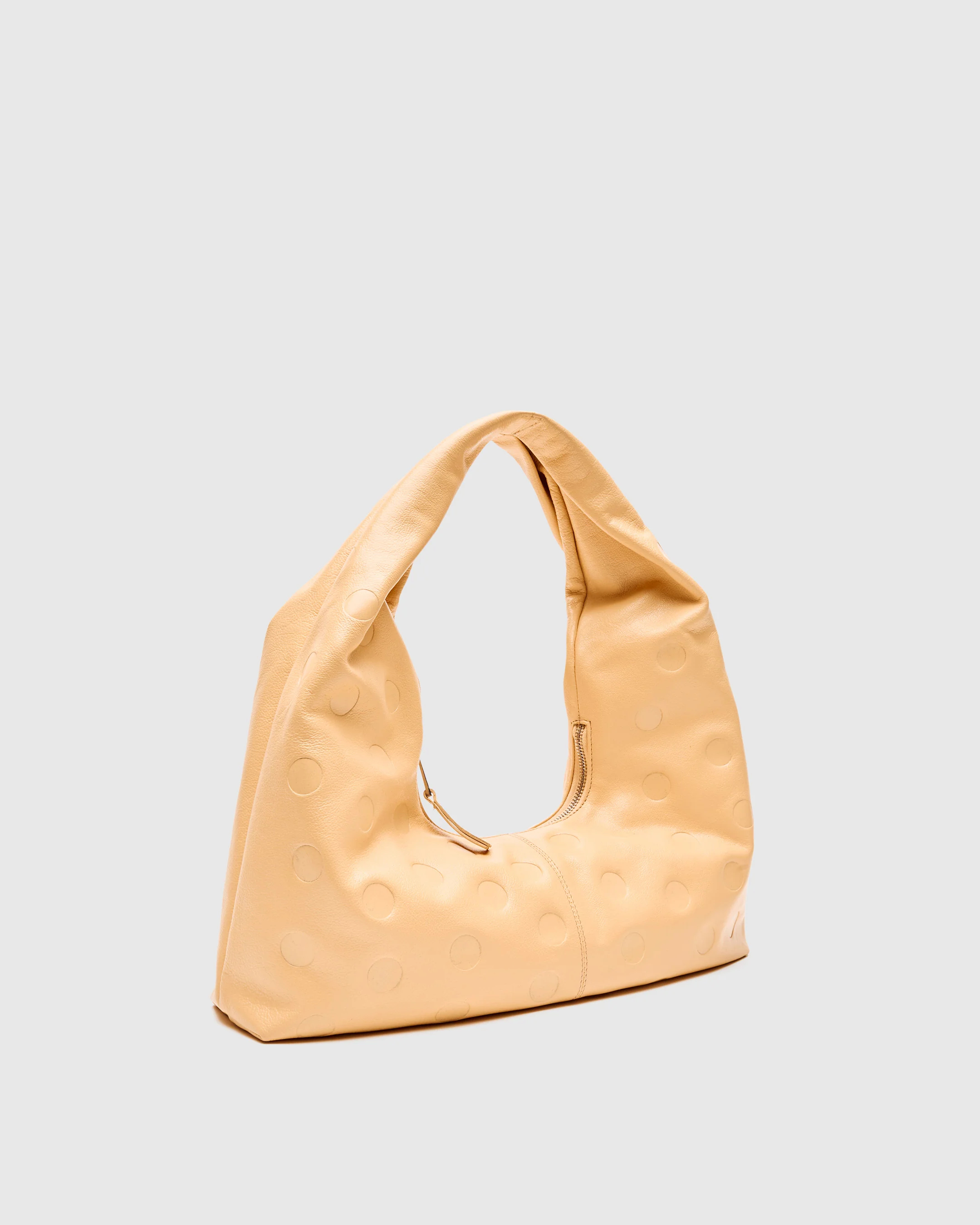 Small Alma Dot Mountain Cream is a stylish and classic bag made from black calf leather with delicate dot-embossed details, giving it a modern and playful touch. The bag features one main compartment with a zipper closure and two inner pockets – one with a zipper and one open – making it easy to keep your essentials organized. Its compact size makes it perfect for both everyday use and a night out.
