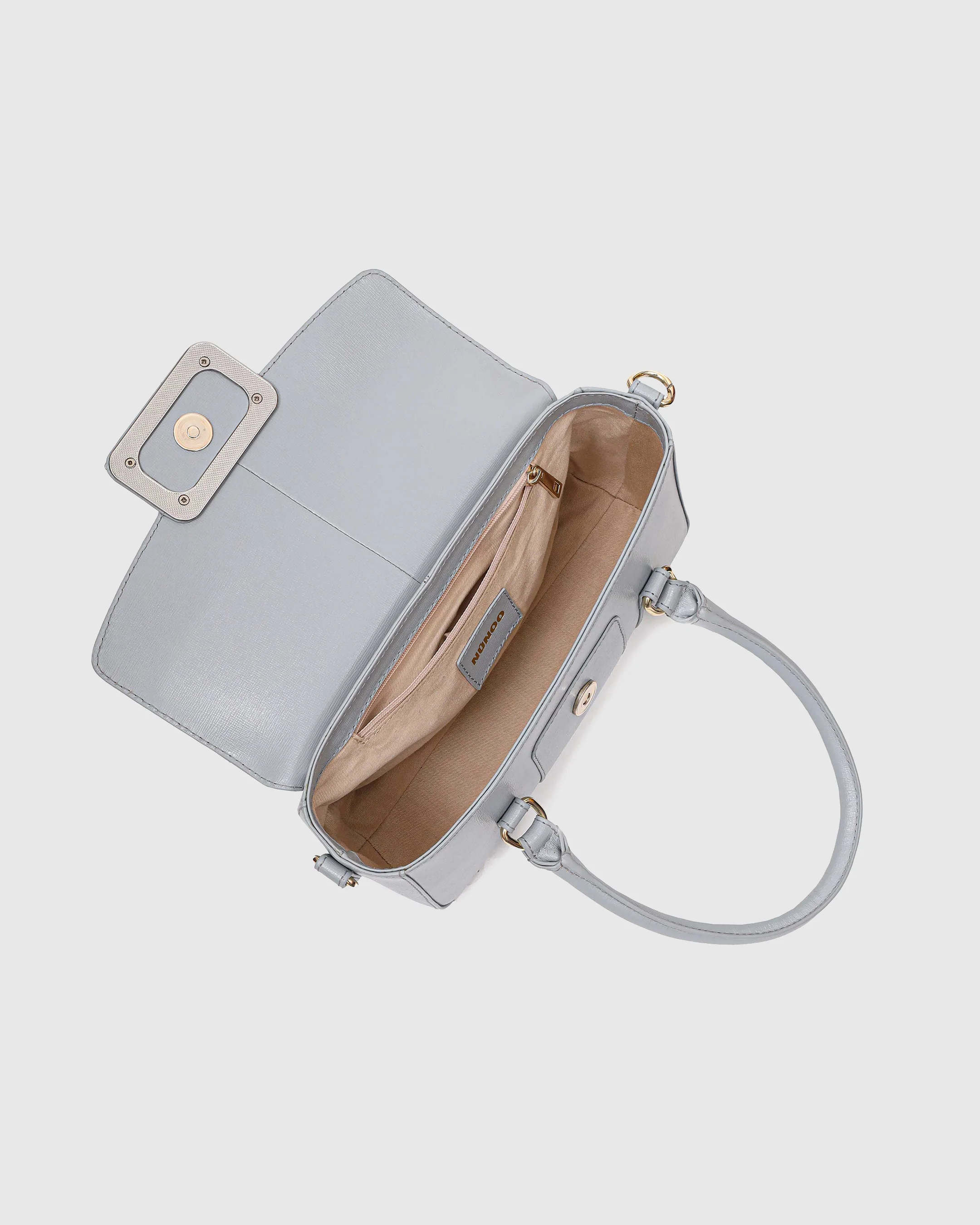 The Maggie bag in light grey is crafted from our popular Florence leather, giving it a timeless and sophisticated look. It showcases a stunning buckle detail shaped like a wavy 'N', adding a unique and elegant touch. The bag closes securely with a magnetic flap. Maggie includes an adjustable and detachable strap, allowing you to carry it over the shoulder or crossbody to suit any occasion. The bag has gold details.